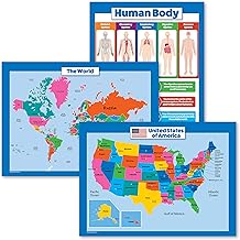 3枚パック – 米国と子供のための世界地図 + 人体ポスターセット (ラミネート加工、18 x 24インチ)
