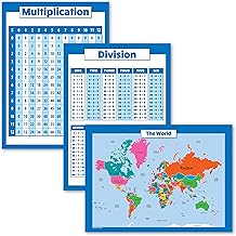 3枚パック - 掛け算表ポスター + 仕切り + 子供用世界地図 ラミネート加工 18インチ x 24インチ
